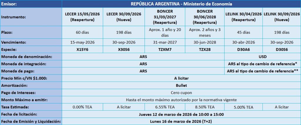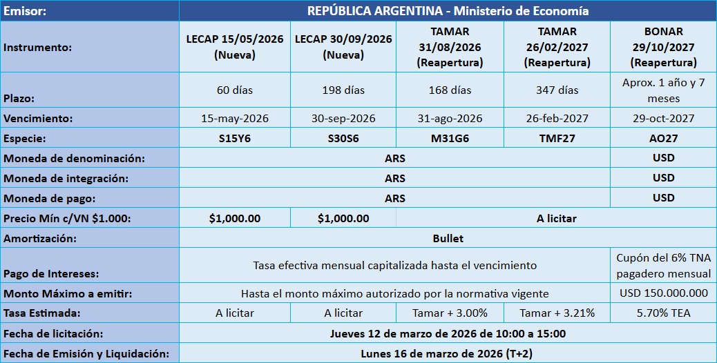 Para el caso del BONAR 2027 (AO27) habrá una segunda vuelta el Viernes 13 de marzo de 2026 de 10:00 a 15:00 (T+1), que será por adhesión con un único pliego al precio de corte.