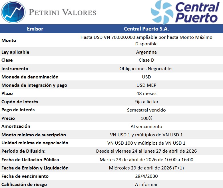 Petrini Valores informa los principales términos y condiciones de la nueva emisión de Obligaciones Negociables de Central Puerto S.A.