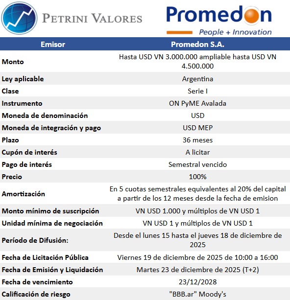 Petrini Valores, en su carácter de colocador, tiene el agrado de comunicarle los principales términos y condiciones de la nueva emisión de Obligaciones Negociables PyME Mediano Impacto Garantizadas por Aval de sus accionistas de Promedon S.A.