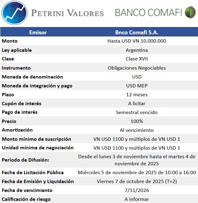 Petrini Valores informa los principales términos y condiciones de la nueva emisión de Obligaciones Negociables de Banco Comafi S.A.
