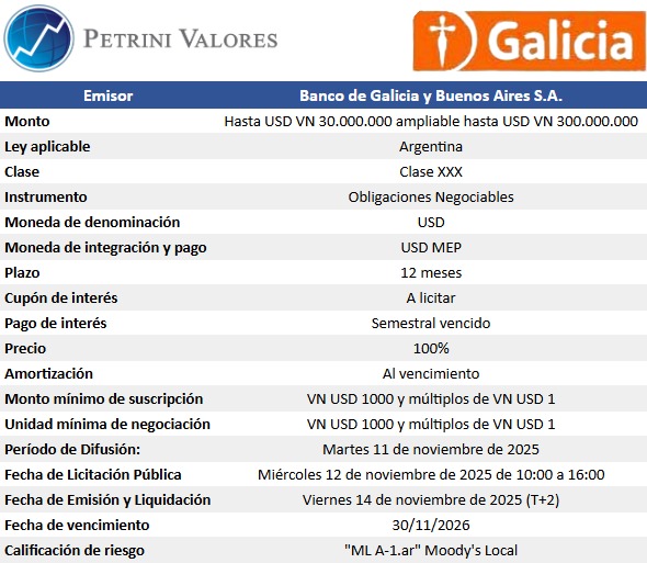 Petrini Valores informa los principales términos y condiciones de la nueva emisión de Obligaciones Negociables de Banco de Galicia y Buenos Aires S.A.
