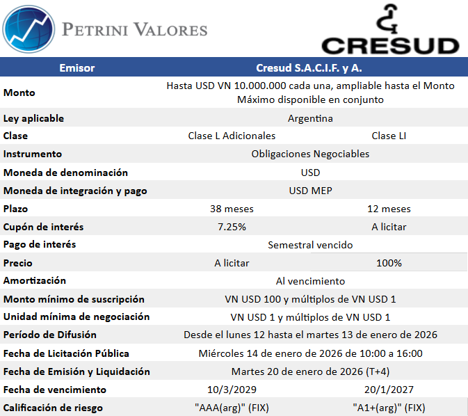 Petrini Valores, en su carácter de colocador, tiene el agrado de comunicarle los principales términos y condiciones de la nueva emisión de Obligaciones Negociables de Cresud S.A.C.I.F. y A.