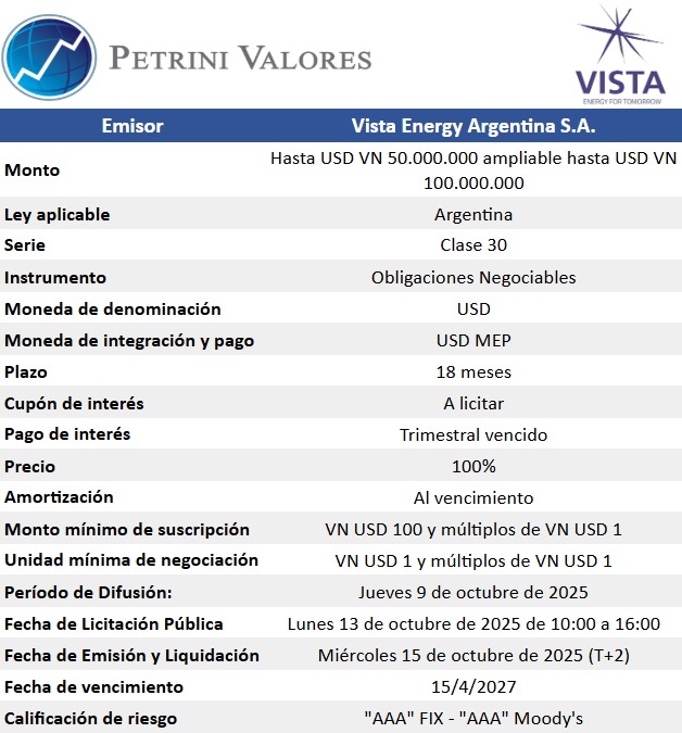 Petrini Valores informa los principales términos y condiciones de la nueva emisión de Obligaciones Negociables de Vista Energy Argentina S.A.