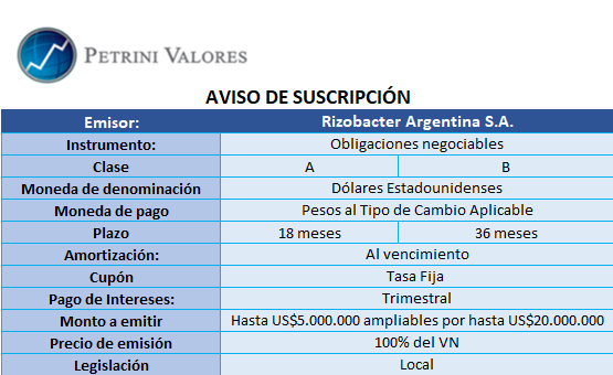 En esta oportunidad, acercamos el aviso de suscripción de Rizobacter Argentina S.A.