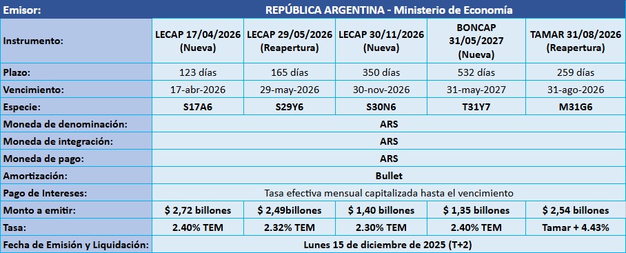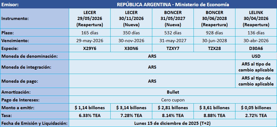 Petrini Valores tiene el agrado de comunicarle los resultados de la licitación de Letras y Bonos del Tesoro Nacional, que tuvo lugar el pasado jueves 11 de diciembre de 2025, con fecha de Emisión y Liquidación el lunes 15 de diciembre de 2025