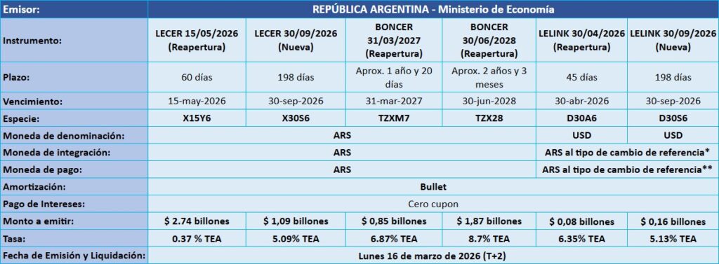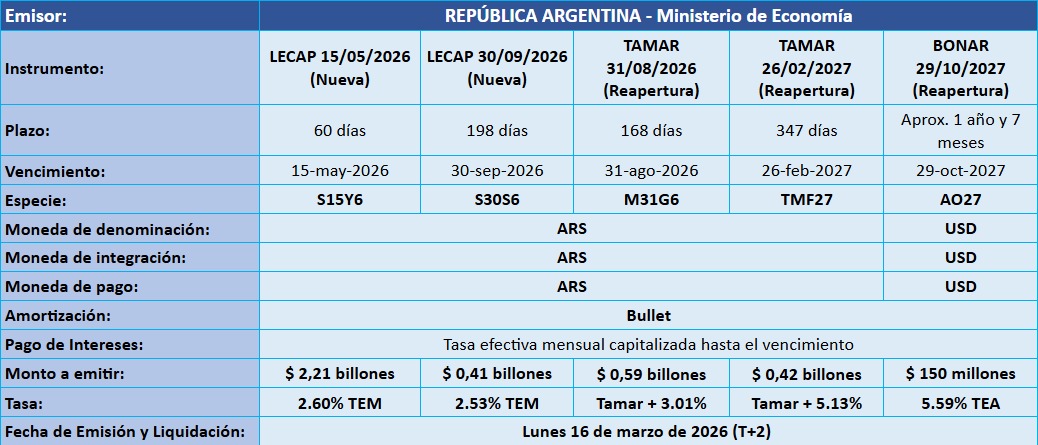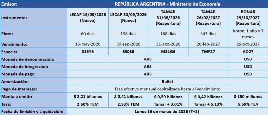 Petrini Valores tiene el agrado de comunicarle los resultados de la licitación de Letras y Bonos del Tesoro Nacional, que tuvo lugar el pasado jueves 12 de marzo de 2026, con fecha de Emisión y Liquidación el lunes 16 de marzo de 2026.