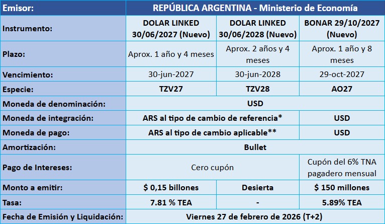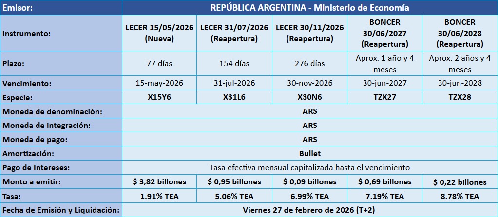 Petrini Valores tiene el agrado de comunicarle los resultados de la licitación de Letras y Bonos del Tesoro Nacional, que tuvo lugar el pasado miércoles 25 de febrero de 2026, con fecha de Emisión y Liquidación el viernes 27 de febrero de 2026.