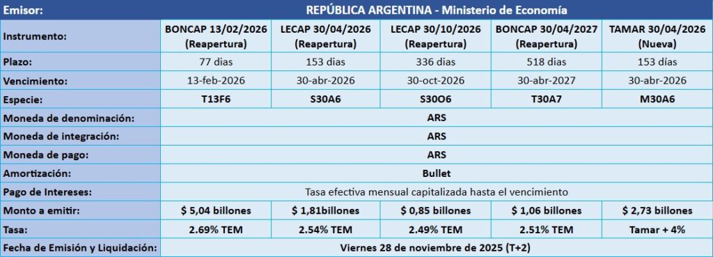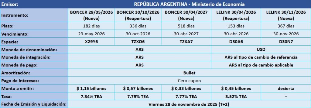 Petrini Valores tiene el agrado de comunicarle los resultados de la licitación de Letras y Bonos del Tesoro Nacional, que tuvo lugar el pasado miércoles 26 de noviembre de 2025con fecha de Emisión y Liquidación el lunes 1 de diciembre de 2025