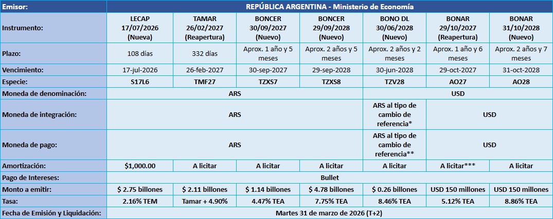 Petrini Valores tiene el agrado de comunicarle los resultados de la licitación de Letras y Bonos del Tesoro Nacional, que tuvo lugar el pasado viernes 27 de marzo de 2026, con fecha de Emisión y Liquidación el martes 31 de marzo de 2026.