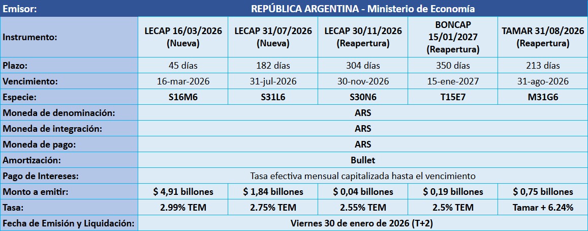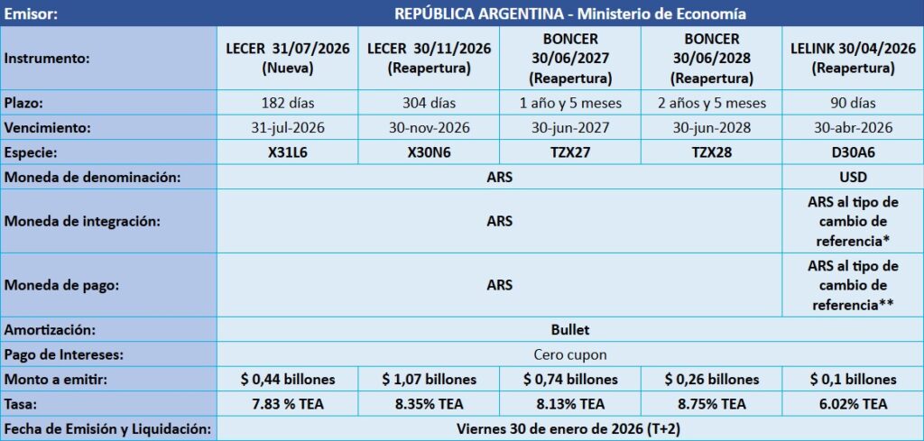 Petrini Valores tiene el agrado de comunicarle los resultados de la licitación de Letras y Bonos del Tesoro Nacional, que tuvo lugar el pasado miércoles 28 de enero de 2026, con fecha de Emisión y Liquidación el viernes 30 de enero de 2026.